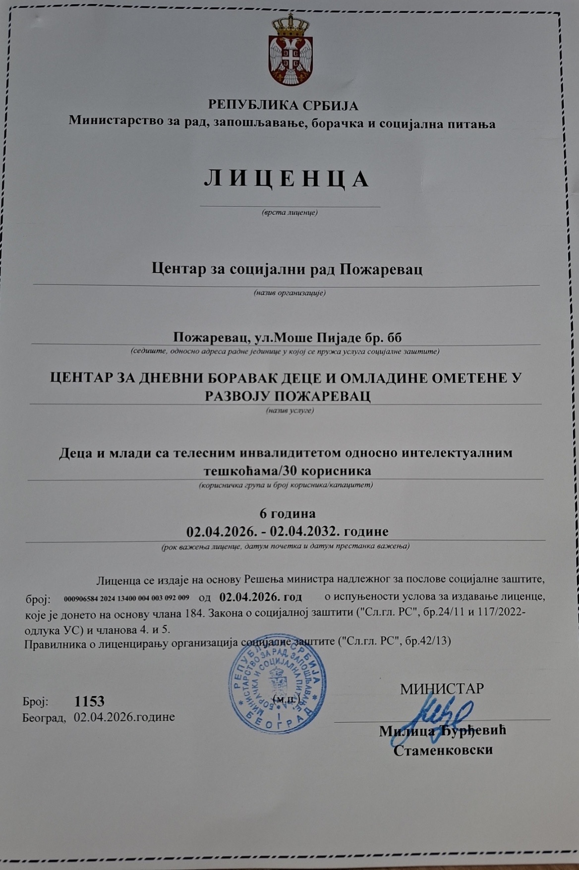 Цeнтар за дневни боравак деце и омладине ометене у развоју који функционише као Радна јединица Центра за социјални рад Пожаревац добио лиценцу за обављање ове врсте делатности на рок важења у трајању од 6 година.
